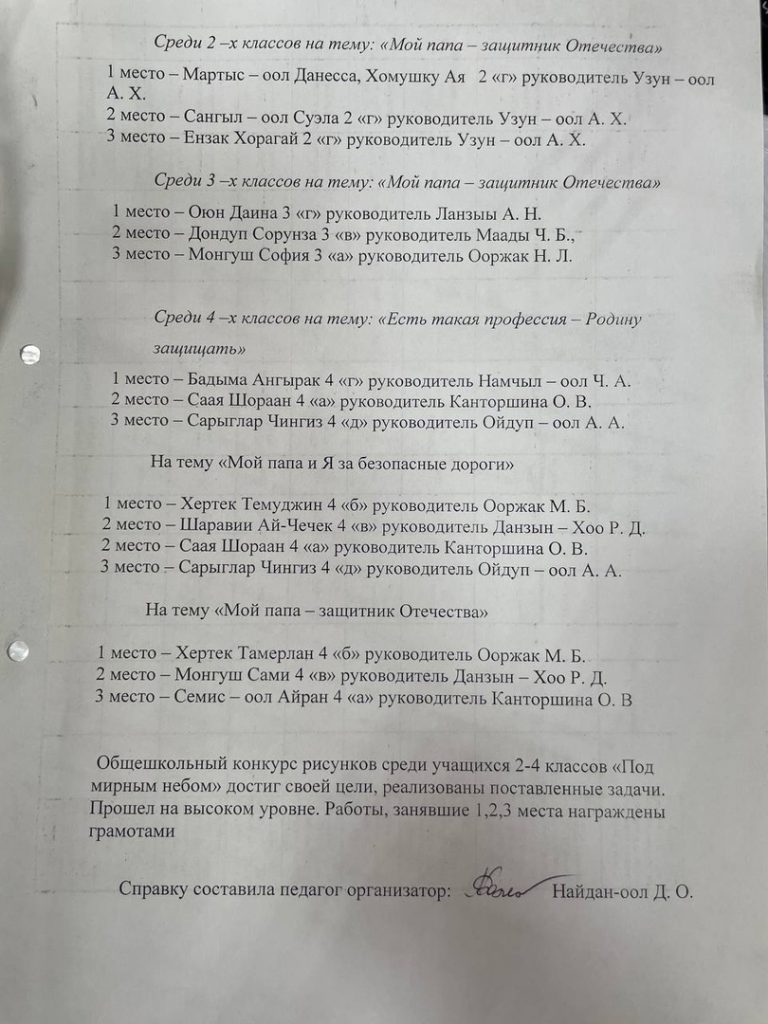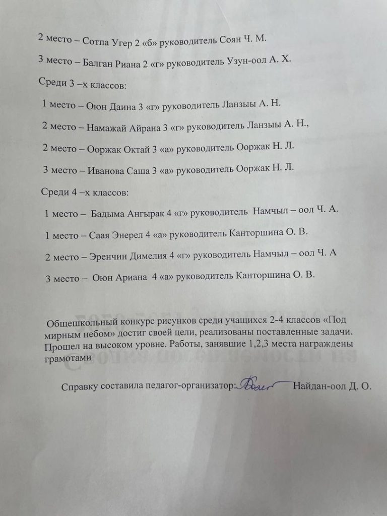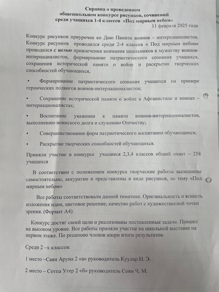 Справка о проведенном общешкольном конкурсе рисунков, сочинений среди учащихся 1-4 классов «Под мирным небом»