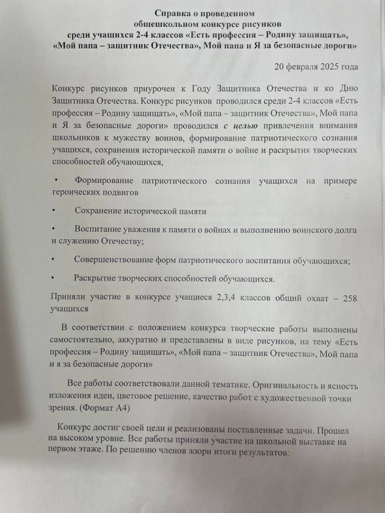 Справка о проведенном общешкольном конкурсе рисунков среди учащихся 204 классов «Есть профессии-Родину защищать», «Мой папа-защитник Отечества», «Мой папа и Я за безопасные дороги»