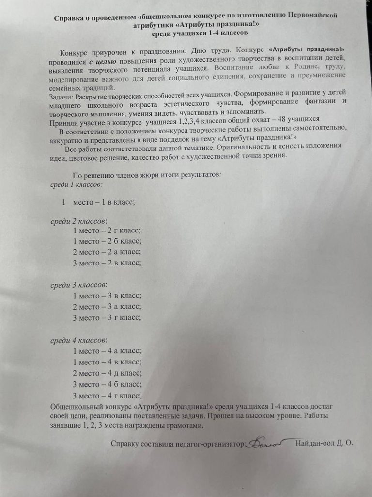 Справка о проведенном общешкольном конкурсе по изготовлению Первомайской атрибутики «Атрибуты праздника!» среди учащихся 1-4 классов