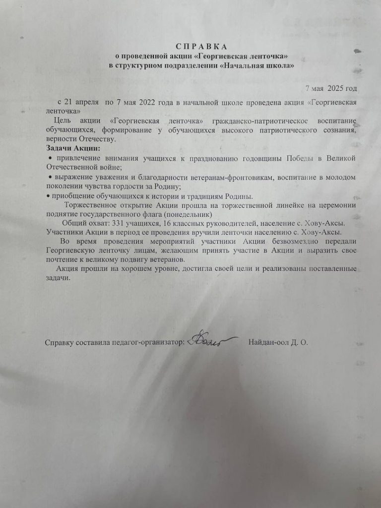 Справка о проведенной акции «Георгиевская ленточка» в структурном подразделении «Начальная школа»