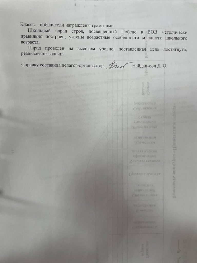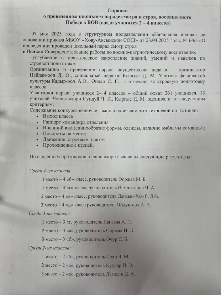 Справка о проведенном школьном параде смотря и строя, посвященного Победе ВОВ (среди учащихся 2-4 классов)