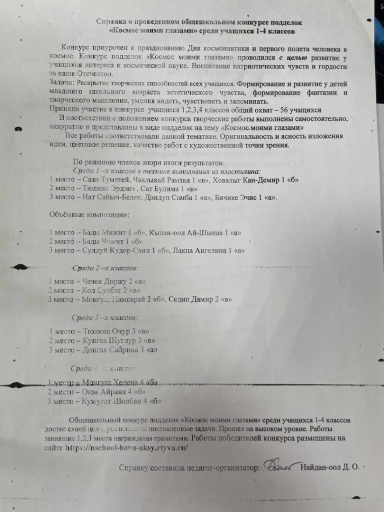 Справка о проведенном общешкольном конкурсе подделок «Космос моими глазами» среди учащихся 1-4 классов