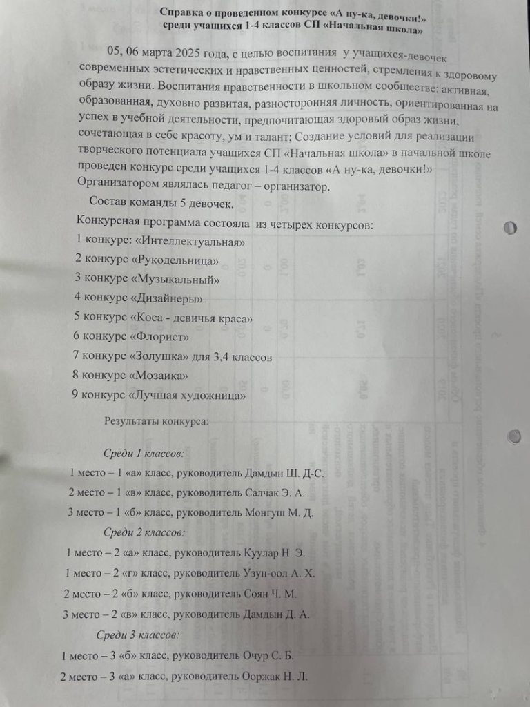 Справка о проведенном конкурсе «А ну-ка, девочки!» среди учащихся 1-4 классов СП Начальная школа