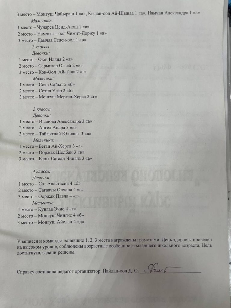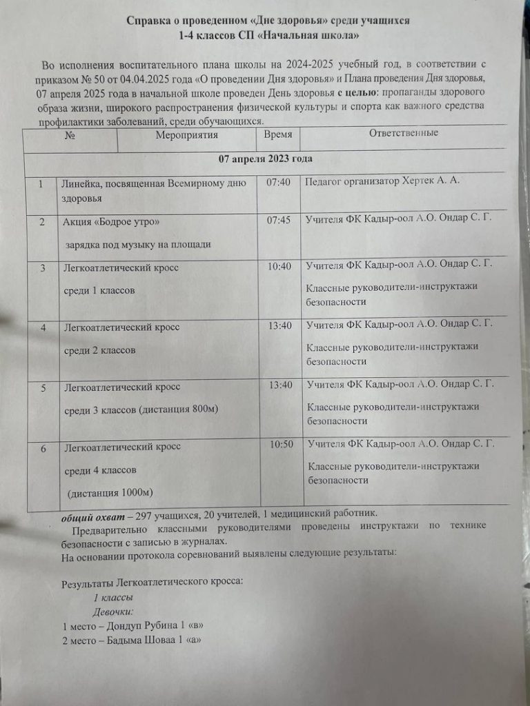Справка о проведенном «Дне здоровья» среди учащихся 1-4классов СП Начальная школа