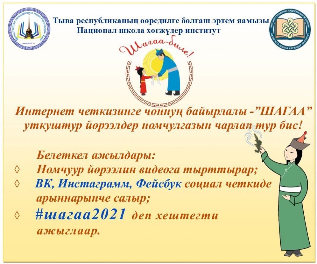 С 20 января не пропустите прямые эфиры в социальных сетях «ВКонтакте» и «Инстаграм» для детей и взрослых на темы: Шагаа будуузу, Чолукшуулу, Сан салыры, Ак чем, Тыва оюннар и другие.